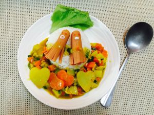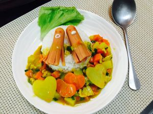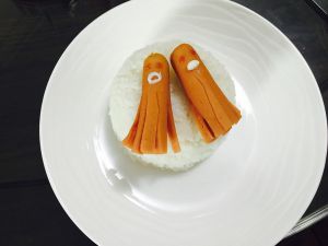 将煮好的米饭盛一碗装盘,火腿肠放在米饭上面,用番茄酱点出眼睛,用沙拉酱点出嘴巴