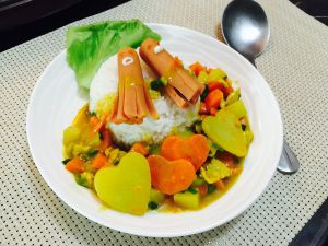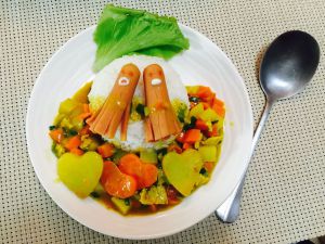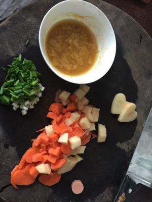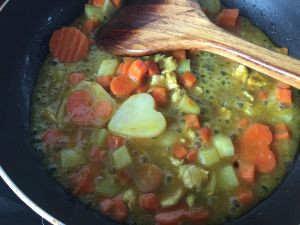 然后放入咖喱块和瘦肉丁煮熟后加入少许盐