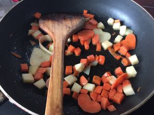 锅里热油后倒入土豆和胡萝卜块翻炒至八成熟