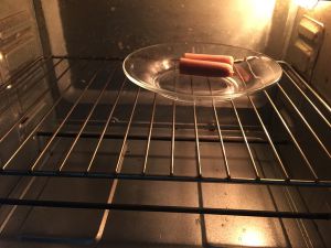 火腿肠切成等长两端,然后切口处切花,放入烤箱中250摄氏度烤5分钟(或微波炉叮1分钟)