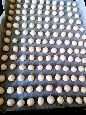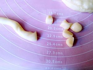 搓成长条状,先切成一个个小方形,然后开始慢慢搓吧,尽量搓小一点太大了烤制过程中容易开裂,这个过程真的很费时间