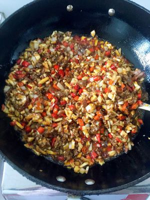 牛肉变色,炒至七分熟的时候倒入香菇洋葱沫翻炒哦,大火炒哦!要不停翻炒的