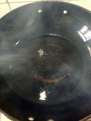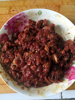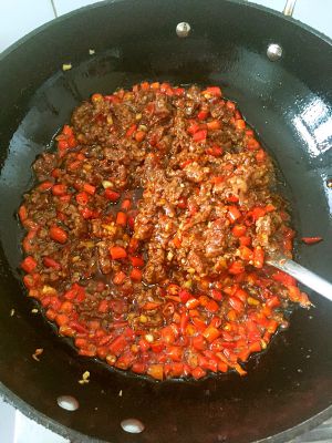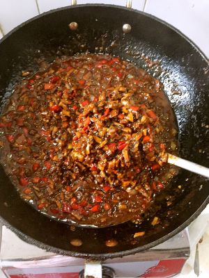 锅里倒油烧热,油放多点哦,是平时炒菜的六七倍哦,这样牛肉酱更容易保存哦