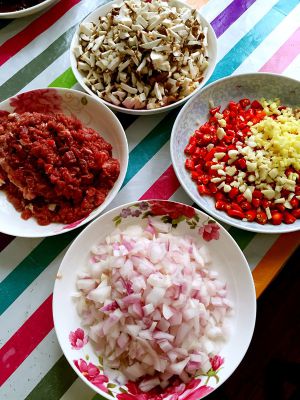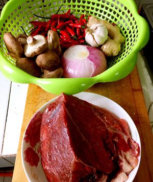 牛肉,香菇,生姜大蒜,洋葱,辣椒全部切成丁状哦