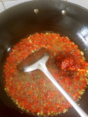生姜大蒜辣椒,放锅里爆炒出香味,加入豆瓣酱翻炒