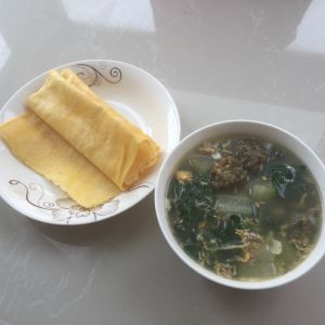 咱徐州人儿喜欢配香喷喷的煎饼(图上是纯手工玉米煎饼从老家带来的额)吃啦啦啦……也可以配米饭馒头之类的呦