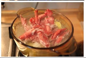 再次煮沸后,加入羊肉片,调入盐,鸡精,煮开后调入多一些的白胡椒粉及香油,洒上葱花即可。