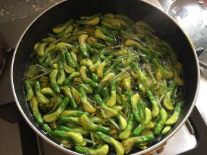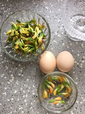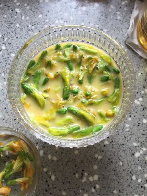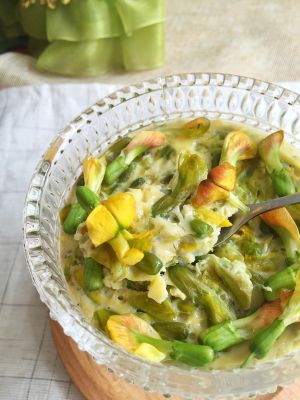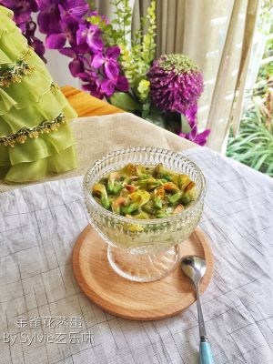 鸡蛋搅打好之后,放一丁点儿盐,千万不要多。搅打均匀,倒入焯烫好的金雀花搅匀,静置一会儿。