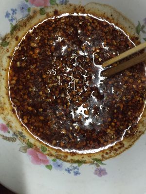 锅里放油 这个油可以多放点 辣椒碎干的 会吸油 油温自己感受下 热点了放入提前泡好的 花椒 香叶什么的!(水不放的) 怕油的可以用小火慢慢炸 我就用小火 炸了大概十分钟 大家火候自己掌握 毕竟每家的煤气灶火候都不一样 看炸的有香味了 (不要焦了就好)把料捞了 把油倒入辣椒碎里 (会发出滋滋滋的声音)搅拌均匀放入干净的罐子里(不要有水)