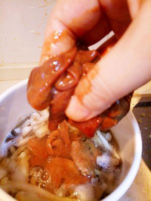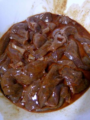 用手均匀洒入猪肝和肉片,大火滚熟,最后加盐和鸡精