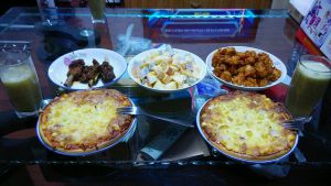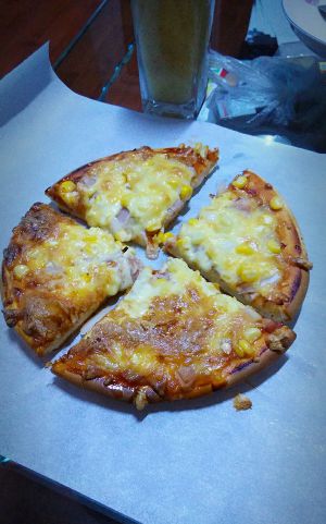 将披萨饼放到烤盘上,抹上一层披萨酱,放一层圆葱,一层芝士,一层培根,一层芝士,一层玉米粒,一层芝士。(玉米粒我先煮了下)。芝士多多放。