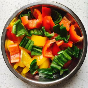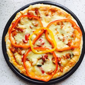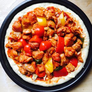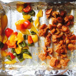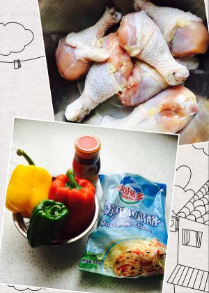 烤箱200度上下火预热5分钟,把青椒,彩椒,琵琶腿肉放在锡纸上,烤箱中层烤10分钟,为的是去除多余水分,烤出的披萨才不会太湿