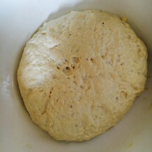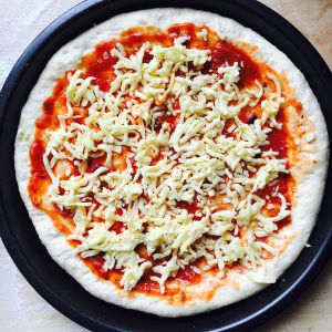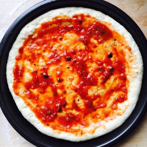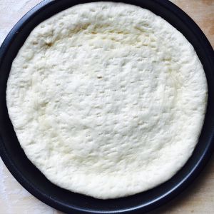 把醒发好的面团用手掌按成饼状,9寸披萨饼盘刷上一层橄榄油,放入面饼