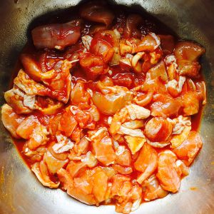 琵琶腿肉切成小块,放入奥尔良腌料抓匀,腌制3小时以上