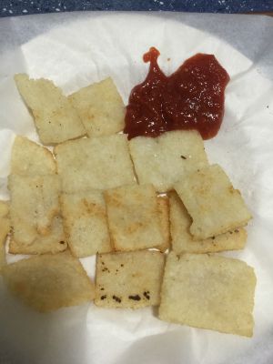 配上老爸自己种的蕃茄做的番茄酱,实在是太美味了。口感是脆脆的皮糯糯的内里哟。这招专治不爱吃饭的小朋友!