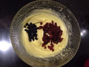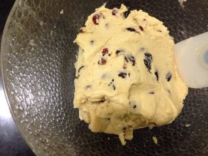 倒入蔓越莓干或黑加仑。如果蔓越莓干的个头比较大,需要先切碎(不要切太碎)。
