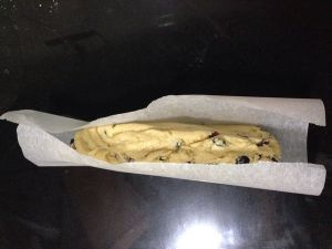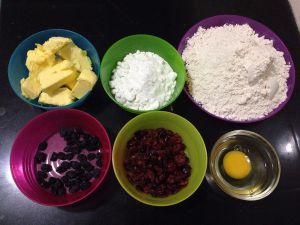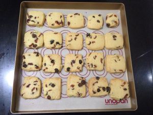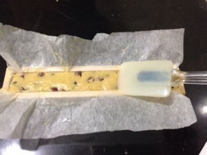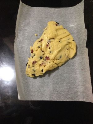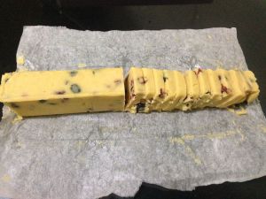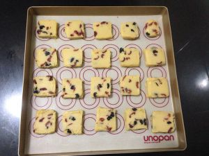 将冻硬的长方形面团用刀切成厚约0.7CM的片。(建议大家还是把蔓越莓和黑加仑切碎,我偷懒没有切,到这步就不太好切了。蔓越莓太大,一切就带动面团渣渣掉下来,不好塑形)