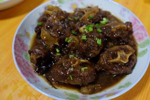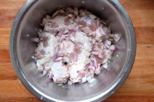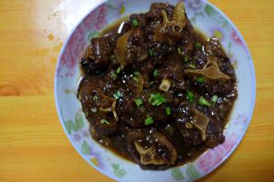 牛尾解冻洗干净,直到基本没血水。切碎洋葱与牛尾拌均匀,倒入料酒,一勺盐,少量橄榄油,继续拌匀,腌制1小时。