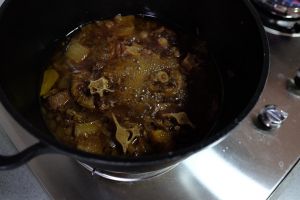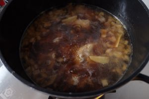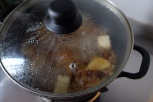 热锅,倒入适量橄榄油,放入黄油,黄油融化后放入少量姜片,蒜泥翻炒,倒入腌制的材料继续翻炒。肉颜色变白色后,加入两勺盐,两勺糖,两勺生抽,两勺老抽继续翻炒。转到煲里,倒入没过食材2cm的清水大火烧开。后转小火,倒入红酒,放入桂皮,八角,黄瓜,黄冰糖。等待