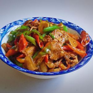 五花肉炒匀酱色,倒入青红辣椒、放入适量盐继续大火翻炒。