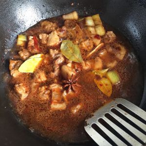 加入清水或高汤,没过食材,放入大料和香叶,大火烧开转小火焖煮50分钟,出锅前撒盐调味即可