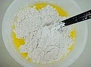 在盆里倒入牛奶、白糖、色拉油搅拌均匀。倒入糯米粉、粘米粉、澄面。充分搅拌均匀,成为稀面糊。