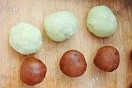 把冰皮分成40克一个,馅分成35克一个。在手上拍点糕粉防粘,然后将冰皮放在手心压扁,放上事先揉圆的馅球,用冰皮把馅球包起来。