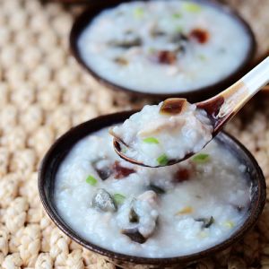 将皮蛋、肉丁、葱姜放入,继续煮一会儿即可