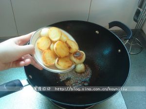 热锅热油,把煮好的土豆放入锅中,煎至金黄色