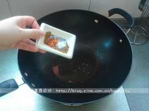把用盐、辣椒面、黑胡椒碎、孜然粉、花椒粉调成的调料粉粉,倒入锅中爆香