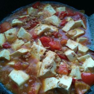 倒入豆腐,调入盐与少量酱油进行焖煮,这样豆腐才能入味。