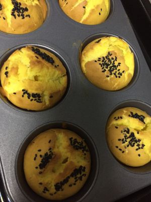 倒入模具。洒上芝麻。烤箱190度上下火中层15分钟