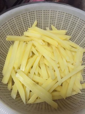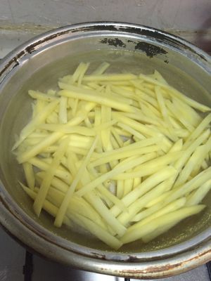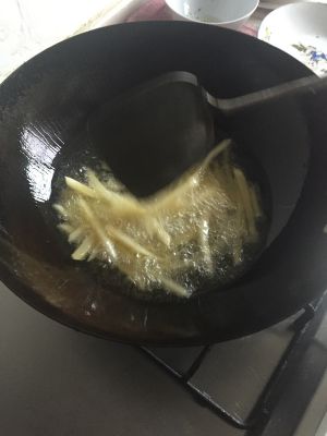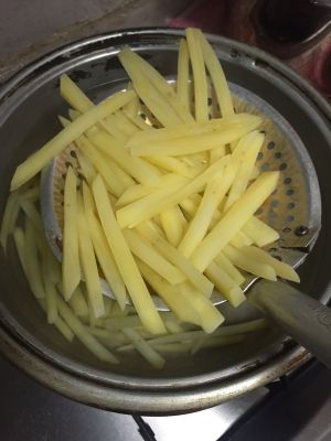 把油倒入锅中加热,一定温度后倒入薯条,进行油炸!