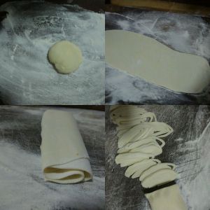 尽力擀面,能擀多薄就多薄,然后叠起来切丝,记得撒面粉,防止粘连
