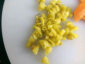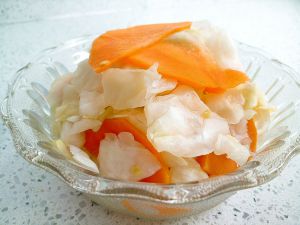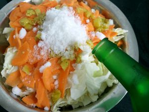 把所以菜放到盆里,加盐糖醋泡椒汁拌匀。