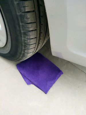 一秒钟做泡菜的关键时刻到了,把包好泡菜毛巾放到汽车轱辘下压一下,现在汽车到处都是,可以多包几个一次就都压好了。