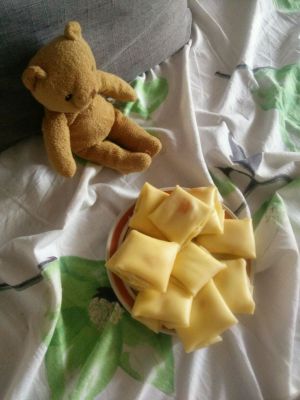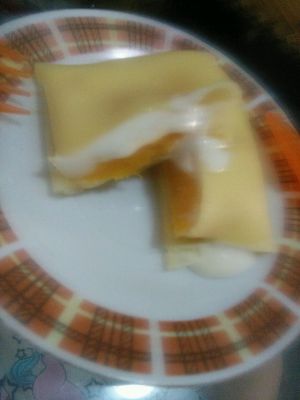 接下来一张饼皮中间放一小坨奶油,我不是很喜欢固体奶油的感觉,所以就打到稍微有点纹路就停了,正常的同志们可以打到七八分呦。再放一块芒果,一大块太带劲了。然后叠起来。