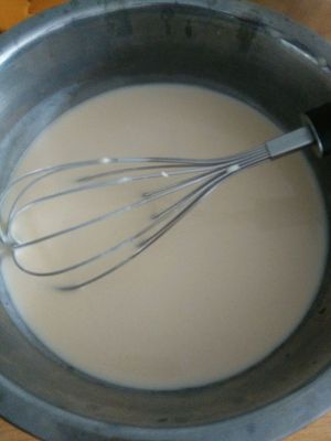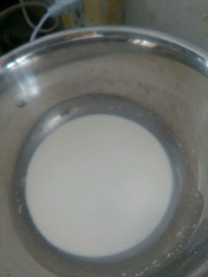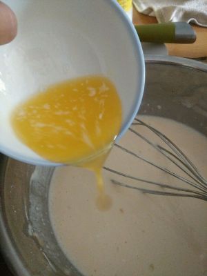 加入牛奶搅拌均匀,我这里一个是鸡蛋颜色浅,另一个牛奶加的有点多,所以成品颜色浅。不过放放就变黄了