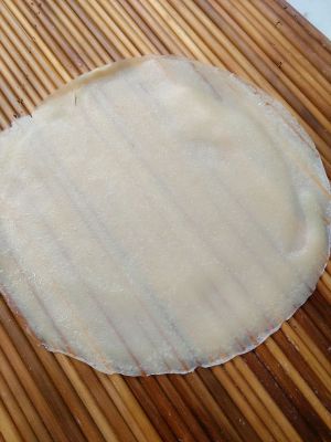 拿起锅将饼倒扣在盖帘上,可以看到饼皮非常晶莹美丽。