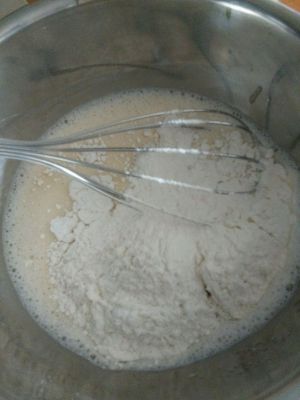 加入低筋面粉,一定要一次性全部加入,这样才好拌匀。