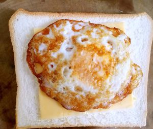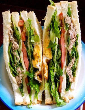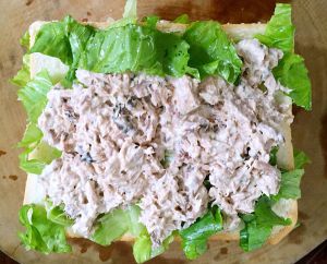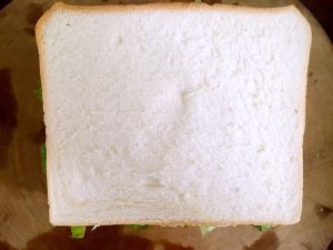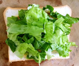 再加一片吐司,铺一层生菜,在上面加金枪鱼碎