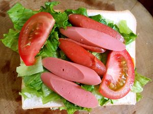 再放上一片吐司,放一层生菜 ,两片番茄切片及火腿肠