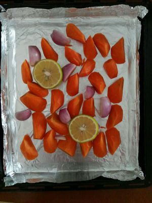 将胡萝卜,洋葱,青柠切好码在烤盘上。