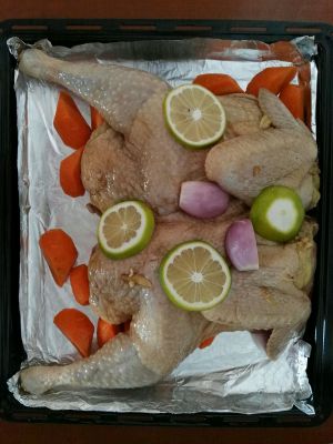 将腌制好的鸡拿出来放到烤盘上,在鸡的身上撒点盐,放入烤箱。