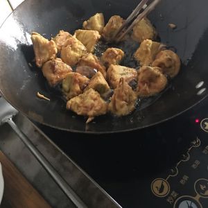 酱油 盐 淀粉 和成水 后 倒油 把和好的淀粉放进去 然后放炸好の茄子 炒到都挂乎 就可以