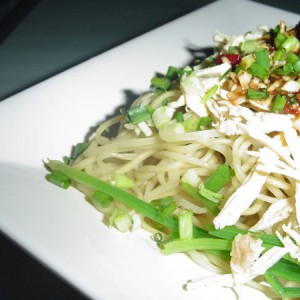 .把鸡丝盖在面上,浇上调料,在放两根焯过水的菠菜叶就OK啦!!!哈哈~~~可惜家里没有豆芽,不然把豆芽铺在盘底,拌在凉面里真是相当经典呢!!!哈哈~~~