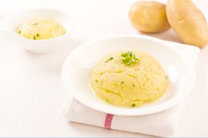 制泥:用擀面杖将蒸熟的土豆块捣成细泥状,