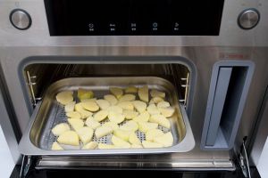蒸制:将土豆块放入蒸盘,蒸箱预热完成的提示音响后,快速将蒸盘放入蒸箱,关上蒸箱门,待蒸箱工作结束后取出蒸盘。