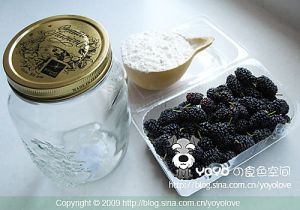 原料:桑葚300克、和桑葚体积相当的凉开水、蜂蜜1大勺、消毒并控干水分的密封玻璃罐。我用的是波米欧立的储藏罐,也可以用玻璃的罐头瓶代替,检查下瓶口,要密封效果好就可以。