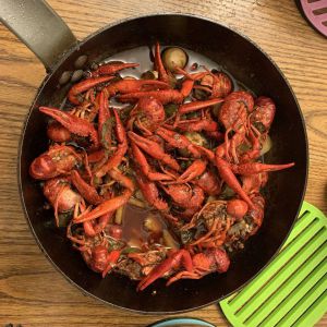 佐料和油烧热以后,开大火,炒虾。中大火翻炒3-5分钟,期间加入十三香粉末和少量盐、生抽、糖。最后放入青椒。